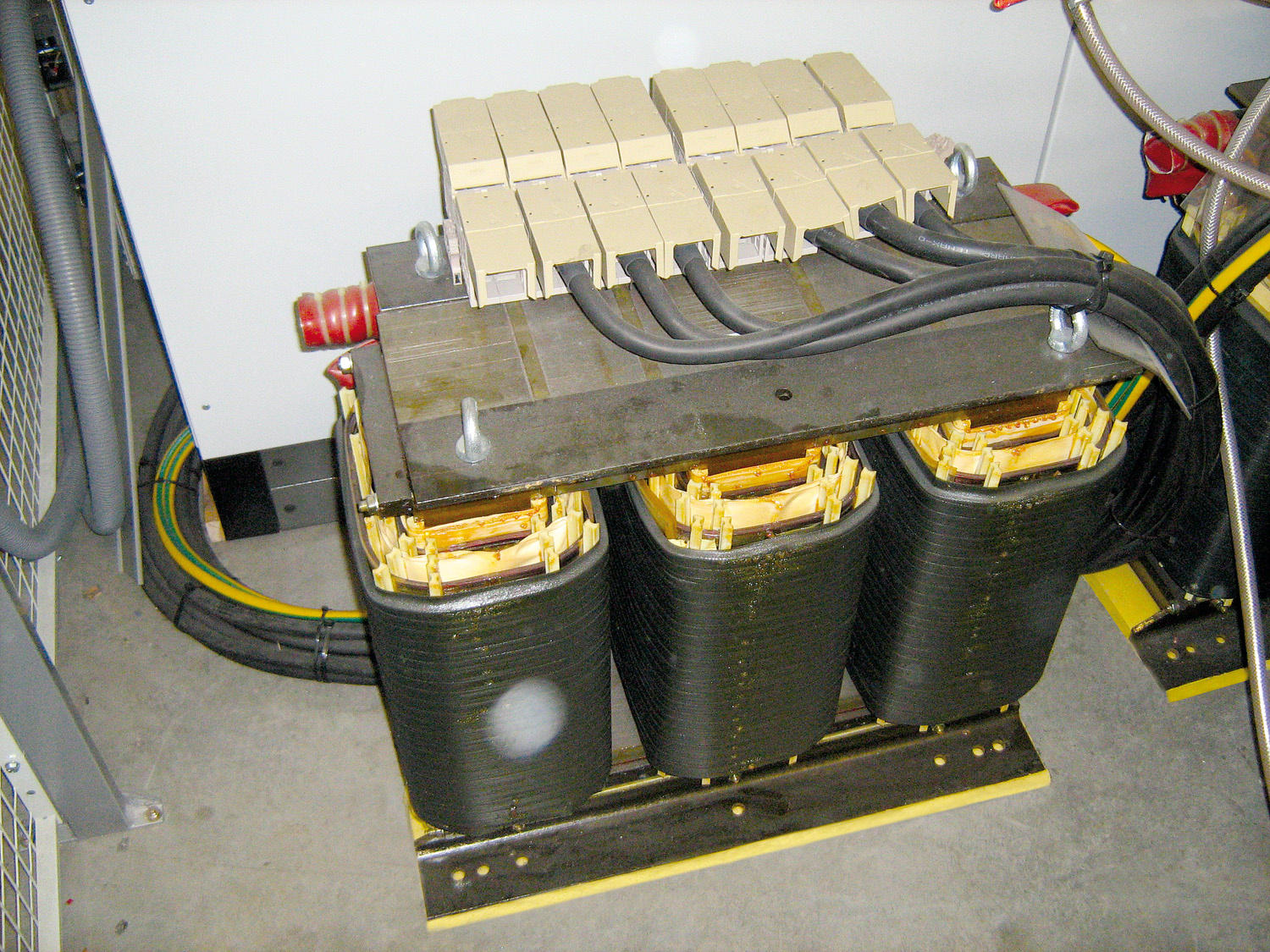Interference frequencies in a switch cabinet caused two parallel-connected transformers to vibrate so much that working quietly in adjacent rooms was all but impossible. Because they stood on the ground, it was their weight that caused office staff who worked in the same building to feel the effects first hand. The resulting noise was equally bad. SLAB plates of the type SL-170-25 reduced the vibration levels of the transformers by 91 percent. Through this application, a pleasant working environment has now been established.